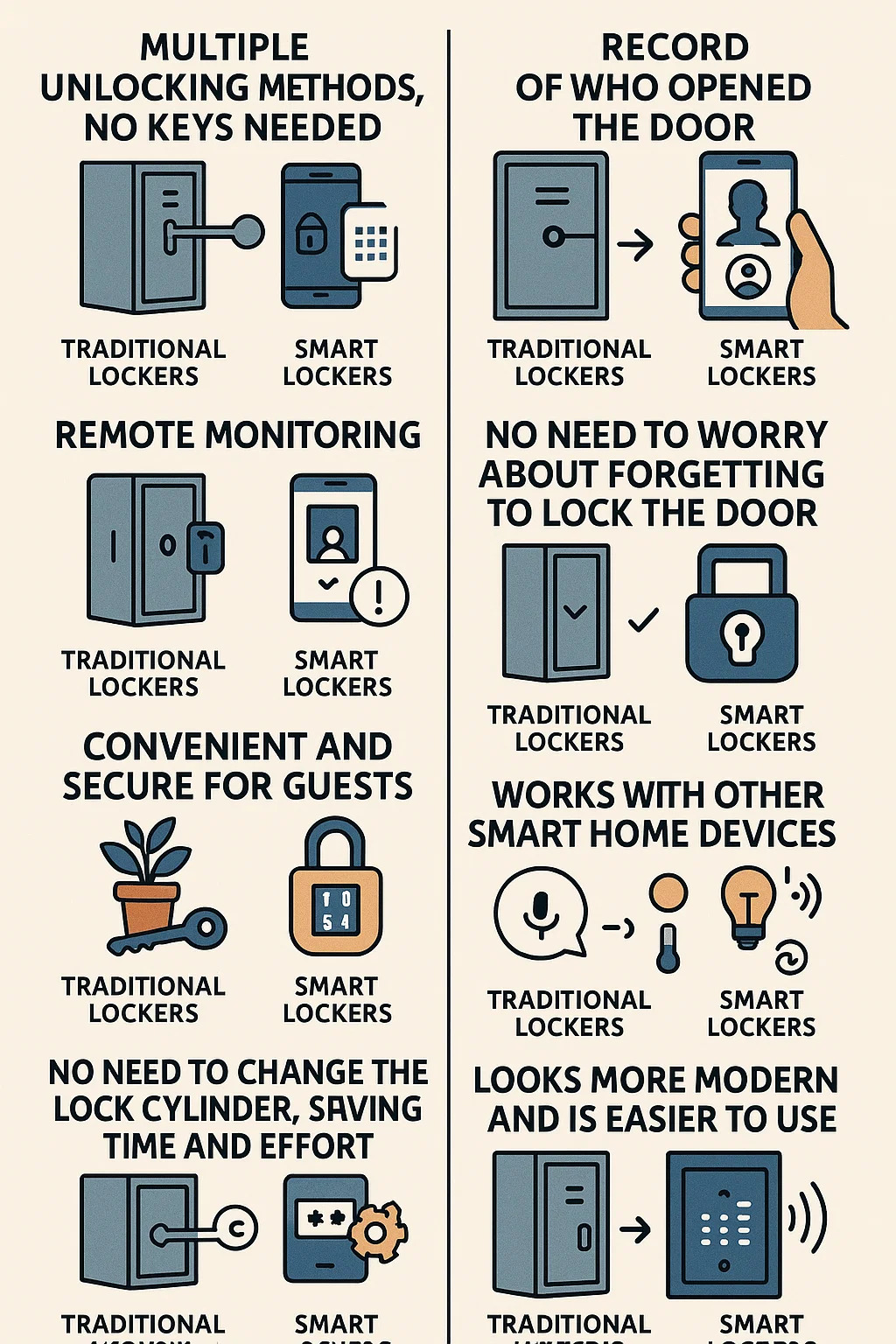 ঐতিহ্যবাহী লকারের তুলনায়, স্মার্ট লকার বেশ কিছু বাস্তব সুবিধা অফার করে: