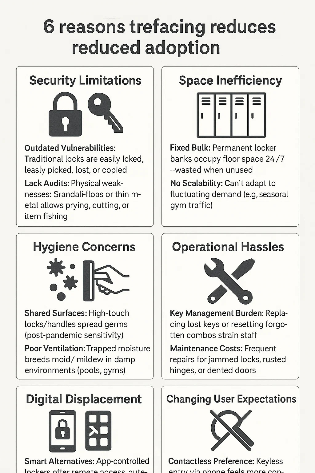 স্থায়ী বাল্ক: স্থায়ী লকার ব্যাঙ্কগুলি 24/7 ফ্লোর স্পেস দখল করে—অব্যবহৃত অবস্থায় নষ্ট হয়ে যায়।